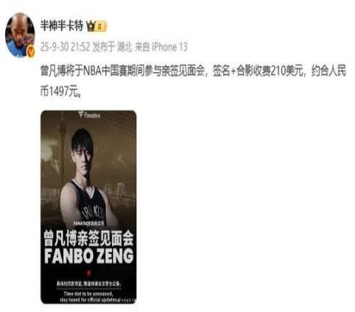 媒體報道,屆時NBA中國賽期間,中國球員、籃網(wǎng)前鋒曾凡博將參與親簽見面會。球迷可以近距離接觸球員,并得到簽名合影,但收費(fèi)高達(dá)210美元,折合人民幣約1500元。