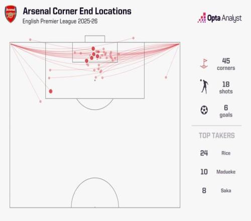 就本賽季而言,阿森納在前6輪英超比賽中總共獲得了45次角球,比其他任何球隊(duì)都多出至少4次,而賴(lài)斯一人就主罰24次。從這些角球中,阿森納完成18次射正,打進(jìn)6球。
