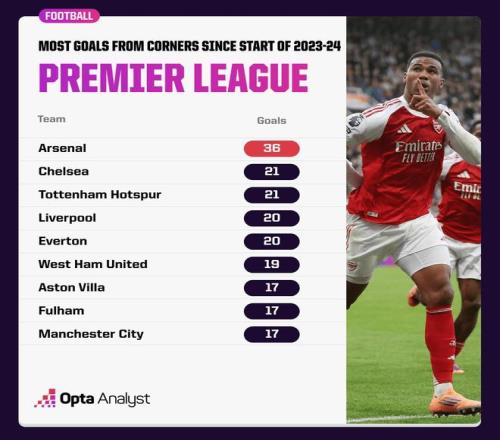 據(jù)統(tǒng)計(jì),自2023-24賽季開(kāi)始以來(lái),阿森納在英超中通過(guò)角球共攻入36球,比其他任何英超球隊(duì)都要多出至少15球。在這段時(shí)間內(nèi),只有切爾西(21球)、托特納姆熱刺(21球)、利物浦(20球)和埃弗頓(20球)通過(guò)角球打進(jìn)20+球。