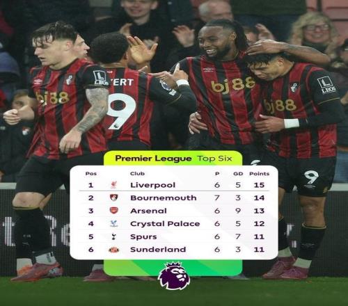 在首輪客場(chǎng)2-4不敵利物浦后,伯恩茅斯在接下來(lái)的六輪英超中取得四勝兩平的不敗戰(zhàn)績(jī),在先賽一場(chǎng)的情況下,以14分僅次于衛(wèi)冕冠軍利物浦位列積分榜次席。