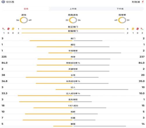 切爾西vs利物浦半場(chǎng)主要數(shù)據(jù):