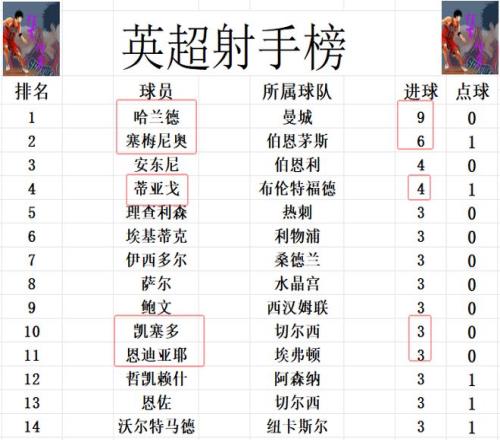 射手榜方面,哈蘭德7輪打入9球,繼續(xù)穩(wěn)居榜首,塞梅尼奧6球排在第2,錯失單刀的蒂亞戈還是和安東尼4球并列第3。恩迪亞耶,沃爾特馬德今天進(jìn)球后,追上凱塞多,埃基蒂克等人3球剛好擠入前十。
