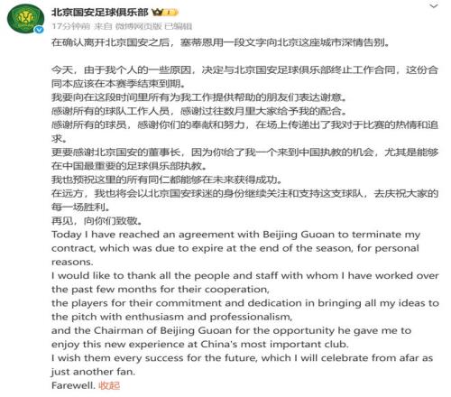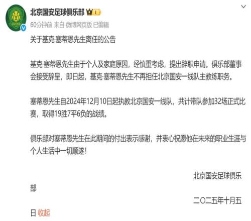 10月5日晚,北京國安官方發(fā)布關(guān)于主帥基克·塞蒂恩的離任公告。原文如下: