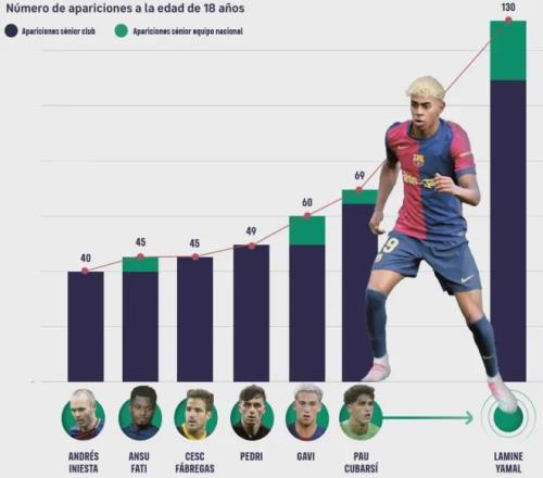 國際職業(yè)足球運(yùn)動員聯(lián)合會(FIFPRO)最新發(fā)布的球員工作量報告,用數(shù)據(jù)印證了許多人的擔(dān)憂。亞馬爾正是典型例子。年僅18歲的他,已代表巴薩出戰(zhàn)130場職業(yè)比賽,累計登場時間達(dá)9772分鐘,這一數(shù)據(jù)幾乎是伊涅斯塔、哈維、法布雷加斯同年齡段時的兩倍。與曾被視為賽事負(fù)荷過高典型的貝林厄姆相比,亞馬爾18歲時的出場時間還要多出31%。