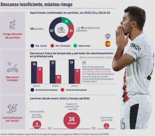 曼城中場羅德里的遭遇則勾勒出球員傷病的惡性循環(huán)。在2022-24兩個賽季中,他共出戰(zhàn)135場比賽,遠(yuǎn)超專家建議的年均55場的安全閾值。2024年歐洲杯決賽后,羅德里遭遇腘繩肌損傷,幾乎沒有休賽期便倉促回歸,完全沒有留出康復(fù)時間。幾周后,他的十字韌帶撕裂,不得不缺席235天比賽。