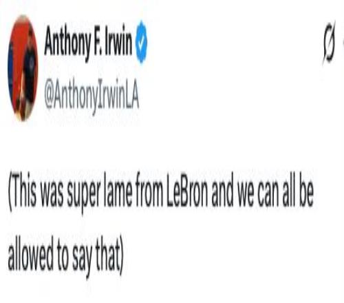 對(duì)于詹姆斯的行為,湖人隊(duì)記Anthony F. Irwin更新社交媒體發(fā)文吐槽:“詹姆斯的做法真的是太差勁了,我們都有權(quán)這么說(shuō)?!?/p>