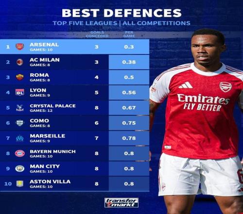 德國轉會市場網站列出了本賽季五大聯賽球隊各項賽事場均丟球最少排行榜,阿森納以0.3球排名第一,米蘭第二,羅馬第三。