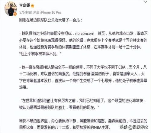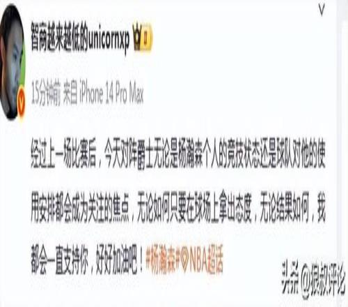 媒體人“王健”發(fā)文:經(jīng)過(guò)上一場(chǎng)比賽后,今天對(duì)陣爵士無(wú)論是楊瀚森個(gè)人的競(jìng)技狀態(tài)還是球隊(duì)對(duì)他的使用安排都會(huì)成為關(guān)注的焦點(diǎn),無(wú)論如何只要在球場(chǎng)上拿出態(tài)度,無(wú)論結(jié)果如何,我都會(huì)一直支持你,好好加油吧。
