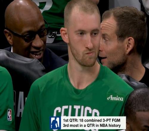 綠軍與騎士首節(jié)合計(jì)命中18記三分,排名NBA歷史單節(jié)三分命中數(shù)第3位。