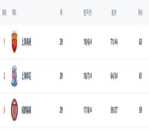 29輪之后,上海海港以63分排名榜首,上海申花以61分排名第2,成都蓉城則以59分排名第三位,提前1輪退出冠軍爭奪。