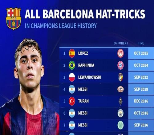 歐冠改制以來巴薩球員戴帽榜:梅西8次居首,費爾明上榜